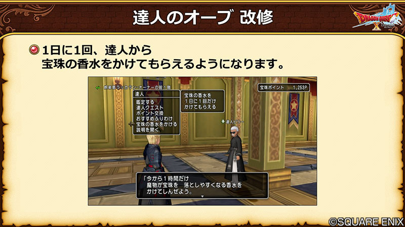 ・1日1回、達人から「宝珠の香水」の効果を掛けてもらえる