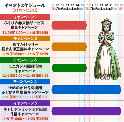各ミッション:ふくびき券5枚 → ふくびき券15枚 コンプ:ゆめのかけらx5 → ゆめのかけらx15 |