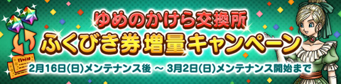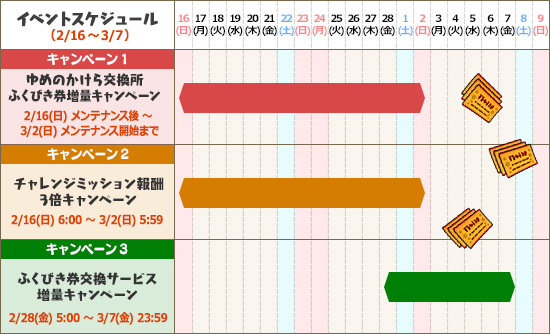 2/16日6:10頃 ~ 3/2日5:50頃(メンテ前まで) ※ゆめのかけら交換所のみ、短いメンテが入る |