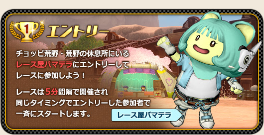 ・チョッピ荒野の休息所 に居る レース屋パマテラ と話して、エントリー