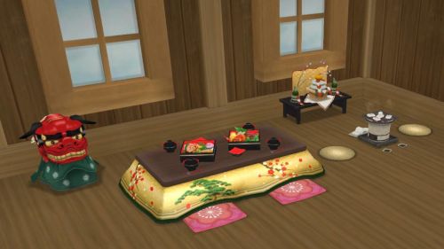 お正月のコタツ、お正月の鏡餅、おもちのせ七輪、獅子舞チェスト
