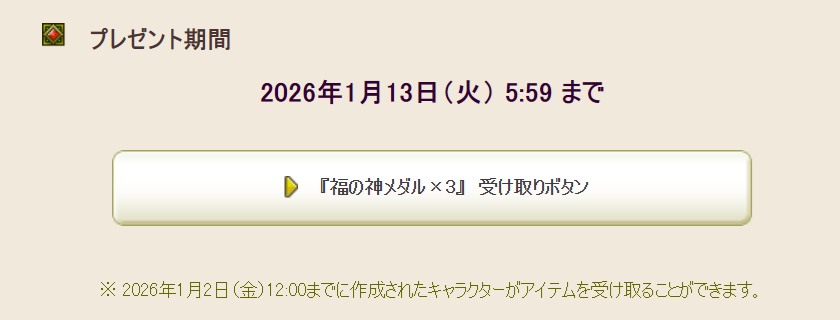 ・公式サイト にて 福の神メダル×3 が配布されているので、受け取っておく