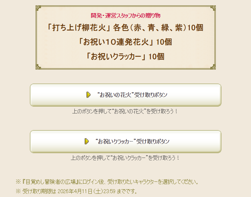 ・公式サイト にて「花火」と「クラッカー」が配布されているので、受け取っておく