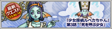 No163 死を呼ぶ少女 2015-02-07更新 受注 ・レーンの村 の「村長の家」にて、ルベカ と話してクエスト受注 ・「教会」に居る ニーブル と話すと、イベント発生 監禁場所 ・コルット地方 → 浜辺の洞くつ と進む ・「無の空洞」に行くと、ボス戦 ボーンプリズナー攻略 2014-09-24更新 レーンの村 外伝第3話 ボス攻略 ※ネタバレ注意 ・ボスを倒すと、イベント発生 ・イベント後、クリア 報酬:青い宝石 x3 / EXP 11450 / 名声 103
