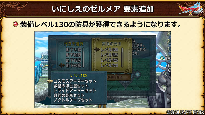 Ver7.5アップデート情報 2025-09-16更新 リリース 25/8/27(水) 13時 リリース 事前情報 Memo ・情報は、随時更新していきます ストーリー / クエスト関連 メインストーリー Ver7.5ストーリー■新MAP雨の島ガナン帝国領ガナン帝国城 クエスト Ver7.5サブクエスト隠者転職隠者クエストクエストスキップ追加(出身村/リンジャ等) 探索系 ぐるぐるゼニアース(新コンテンツ) バトルコンテンツ 異界アスタルジア ■新仲間キャラカブナンナドルタムこころ一覧(新キャラ)プレゼント(新キャラ)新おめかし衣装 深淵の咎人 燦滅のノクゼリア※9/16より断罪のゆびわ(5段階目) 源世庫パニガルム 冥闇角フォルガノス(昏冥ボス)※9/1より昏冥の精霊(LV10解放) ゼルメア LV130防具追加地下24階ボス(新型) ブートキャンプ 練武の鎧竜(新ボス)新実績 その他 新モンスター(転生除く)ピラミッド調査報告書(新要素)破片アイテム追加(コインボス) 戦闘関連 隠者 固有技スキルライン※職業クエストは「クエストの項目」を参照 職業調整 Ver7.5変更点竜術200p、魔戦強化、パラ強化、一部呪文調整 達人のオーブ 新宝珠 その他 経験値の通帳2(有料)特訓33p解放 アイテム関連 装備 LV130防具■白宝箱(LV128防具)常勝のよろいアンテイクドレス迅雷のスーツ烈風のころも妖精郷の舞踏服 職人 新レシピ(新防具)新素材 景品 メリーポコ景品(ベルト倉庫のカギ/交換レート変更等) その他 装備画面の改修ハッピーハート(Ver7.6より値下げ) 生活系 便利機能 かんたんショートカット配信ルーム おしゃれ関連 プレミアム髪型4(有料)マイコーデ(武器チャーム)妖精の姿見(カメラ移動) 住宅関連 達人エージェントロボ(達人機能) 釣り 新魚褒美追加さかなの置物(8/29より) その他 体験版(大幅緩和)大富豪(報酬更新) ゲーム外の機能 超便利ツール Ver7.5変更点ふくびき3等更新、どこでもパーティチャット、異世界放送局 等